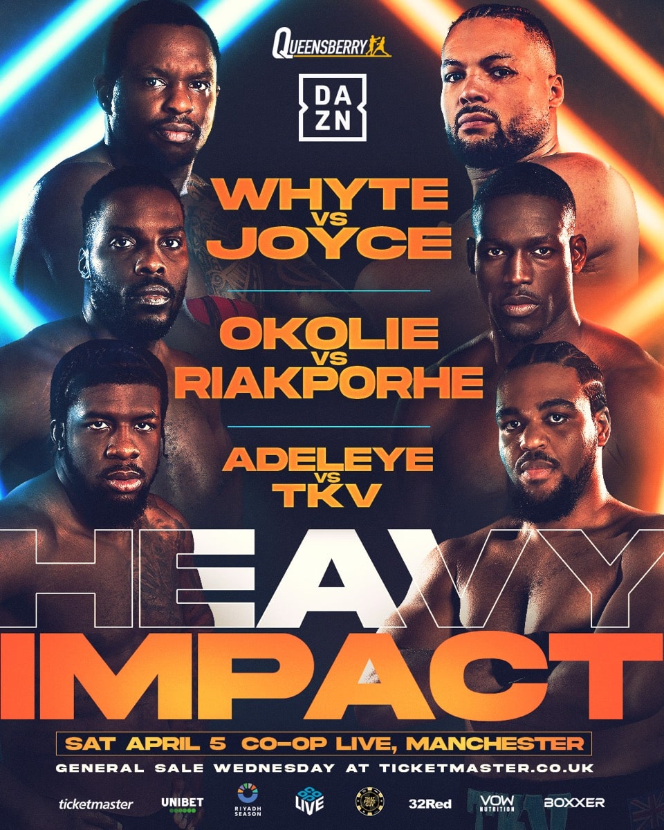 في معركة الدعم الرئيسية ، يحارب لورانس أوكولي (21-1 ، 16 كوس) ضد ريتشارد رياكبور (17-1 ، 13 كوس). سوف يكافح أوكولي ، البالغ من العمر 32 عامًا ، بطل WBO السابق ، للمرة الثالثة في الوزن الثقيل منذ أن ارتفع العام الماضي في مايو ، عندما تغلبوا على لوكاس روزانسكي في الجولة الأولى من الضربة القاضية. يخرج Cruzer Riakporhe ، 35 عامًا ، من فقدان القرار بالإجماع المقيد بقيمة 12 جولة إلى كريس بيلام سميث في 15 يونيو من العام الماضي.