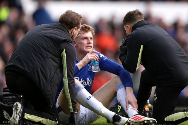 يتلقى Jarrad Branthwaite من Everton من Everton العلاج الطبي خلال مباراة الدوري الممتاز بين Everton FC ومانشستر يونايتد FC في Goodison Park في 22 فبراير 2025 في ليفربول ، إنجلترا. (تصوير لويس ستوري/غيتي إيمايز)