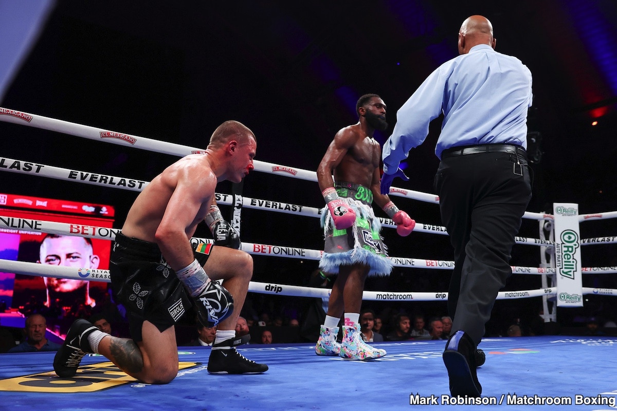 عند منتصف الجولة الأولى ، أطلقت طوفان من اللكمات الصغيرة معاناة في مقر جذوعه ، حيث أخذ عدد الحكم تشارلي فيتش.