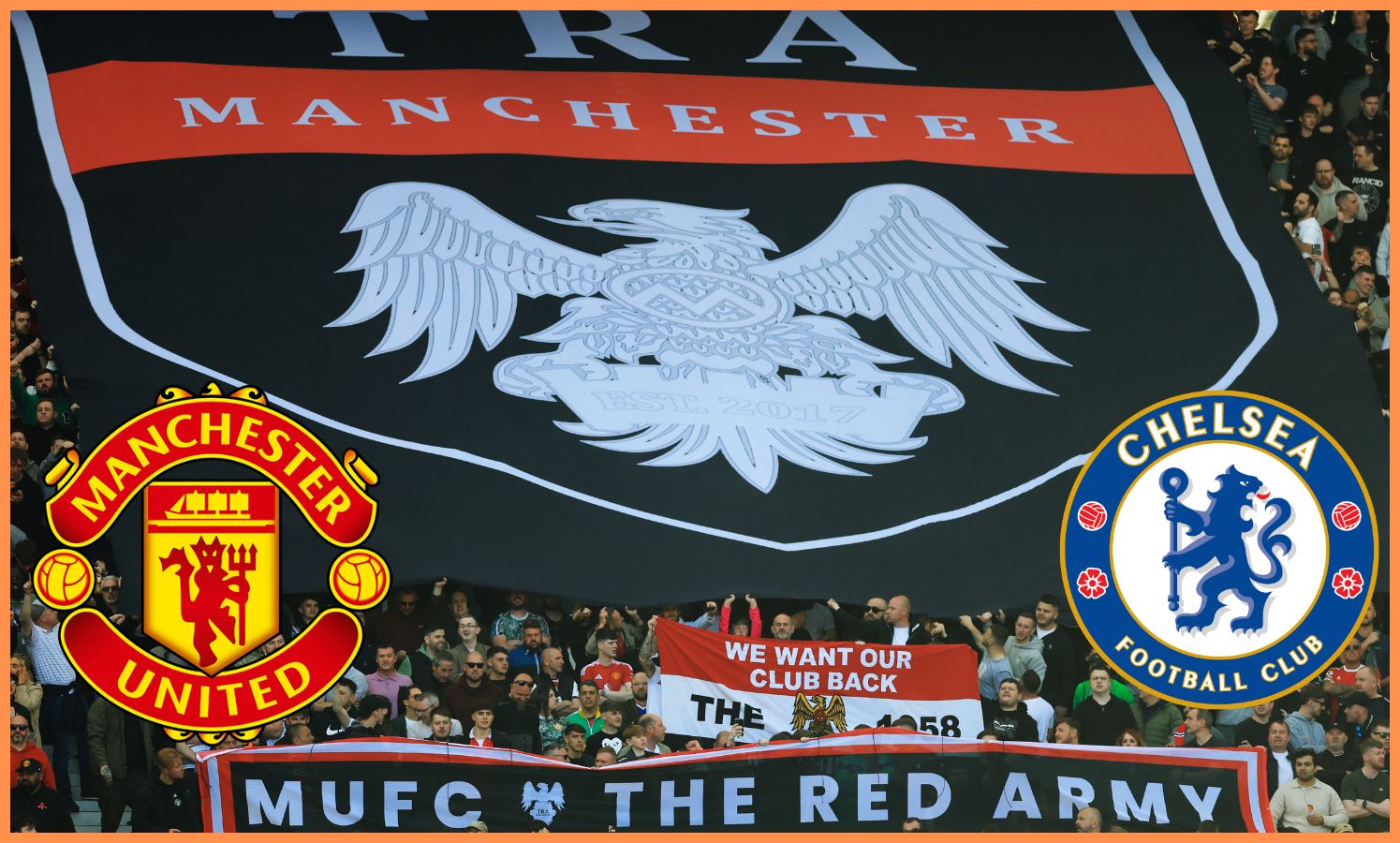 مجموعة بقيادة مشجعي مانشستر يونايتد ، لافتات معرض “الجيش الأحمر”. (تصوير كارل راين/غيتي إيموكيز)