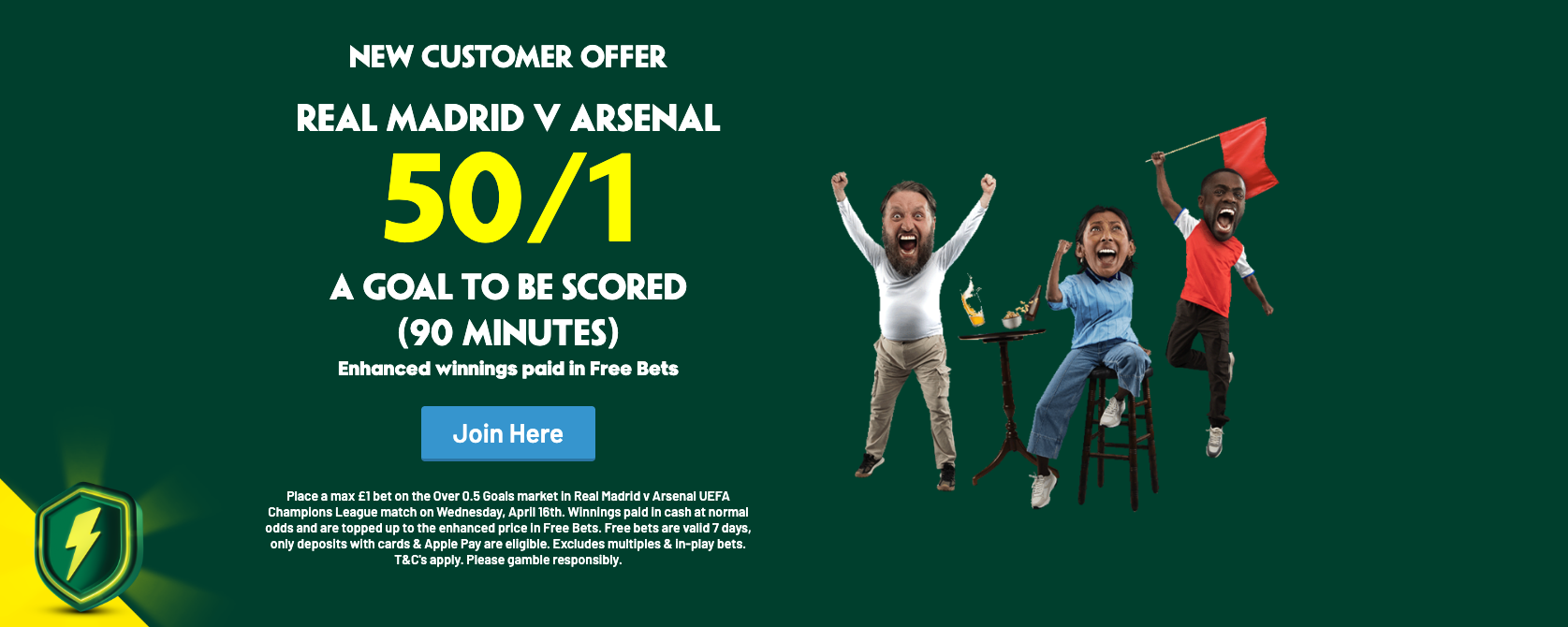 - اجعل رهانًا أقصى قدره 1 جنيه إسترليني في السوق لأكثر من 0.5 هدف في ريال مدريد ضد مباراة دوري أبطال أوروبا (90 دقيقة) يوم الأربعاء 16 أبريل.